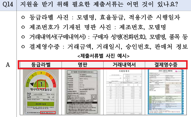 - 서류 업로드: 거래내역서, 영수증, 효율등급 라벨, 명판 사진 등 첨부