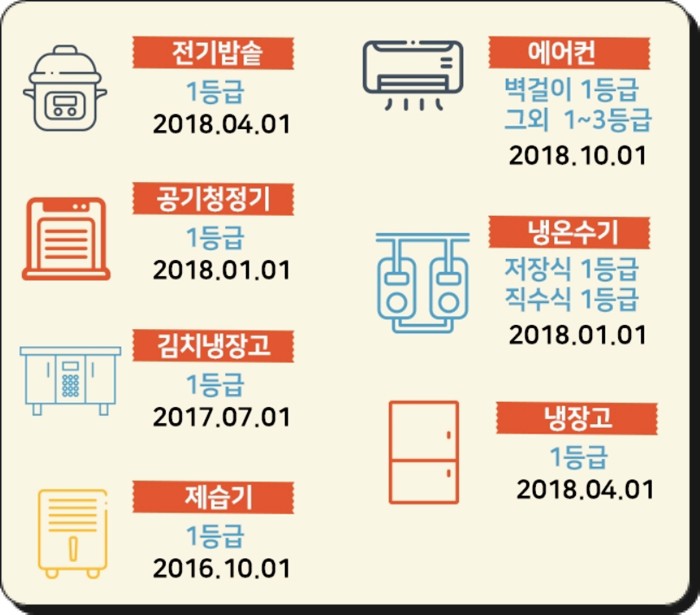 - 냉장고, 김치냉장고, 에어컨, 세탁기, 전기밥솥, 유선진공청소기, 공기청정기, TV, 제습기, 의류건조기, 식기세척기